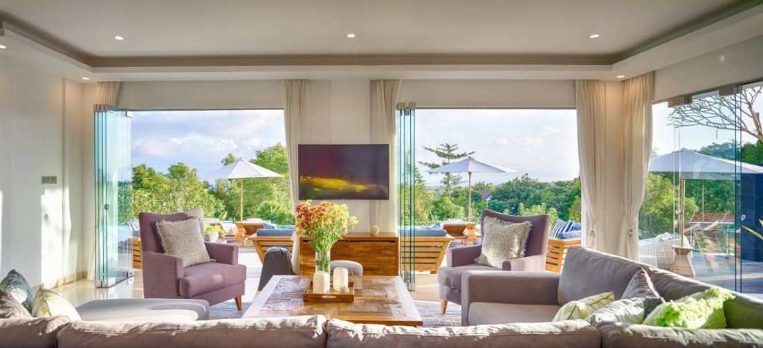 Living areas: Air-conditioned indoor living & dining area with Satellite TV channles, Rooftop terrace entertainment area, Air-conditioned Media Entertainment room with widescreen TV and large sofa, poolside terrace lounge areas, fashionable sunken seating area inside the pool. Bedroom: 4 air-conditioned double bedrooms, 3 with king size beds & 1 with twin beds, all with ensuite bathrooms, fitted with a teakwood floor and equipped with wardrobes and safety deposit box and balcony deck. There is an additional twin bedroom for 2 children and adjoining nanny room with a shared bathroom. Entertainment: Air-conditioned TV entertainment room with Satellite TV with international channels, DVD Player & DVD library, IPod speakers, Large TV in the main living room area, Miniture golf course on premises with golf equipment, Wifi Internet. Sports:  1 private 16 meter long x 7 meter wide x 1.5 meters deep, infinity style pool with stunning views, bordered by a wide timber deck furnished with sun loungers, pool incorporates a jacuzzi and a fashionable sunken seating area for relaxation, fully equipped air-condtioned Gym Room, a Steam Room & Spa Massage Room.;;Fully Equipped Kitchen, and the flawless service of its team of staff.