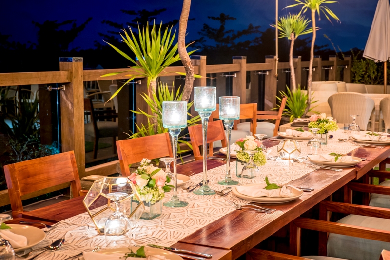 - Dinner decoration includes photobooth, fairy light/light bulb, simple table set up for 6 pax with centerpieces and candles, banana trunk with candle, 4-guest centerpieces, welcome board, registration desk, angpao box, guestbook.